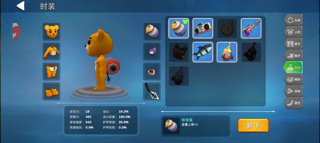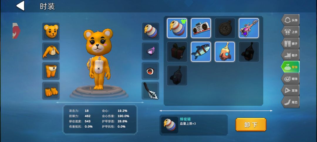 3......第一件,布偶套装,整体是一个可爱的布偶熊外加一个背饰蜂蜜罐,整体来说还是体面看的,属性增加血量上限总体增加 12 点(每一个时装增加 3 点),获取方法,商城用紫晶购买,一件 180 紫晶!