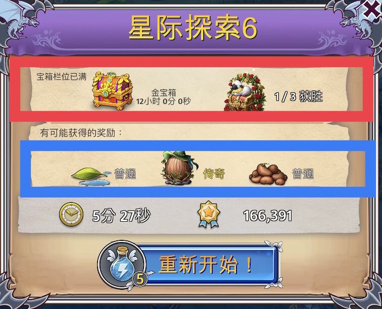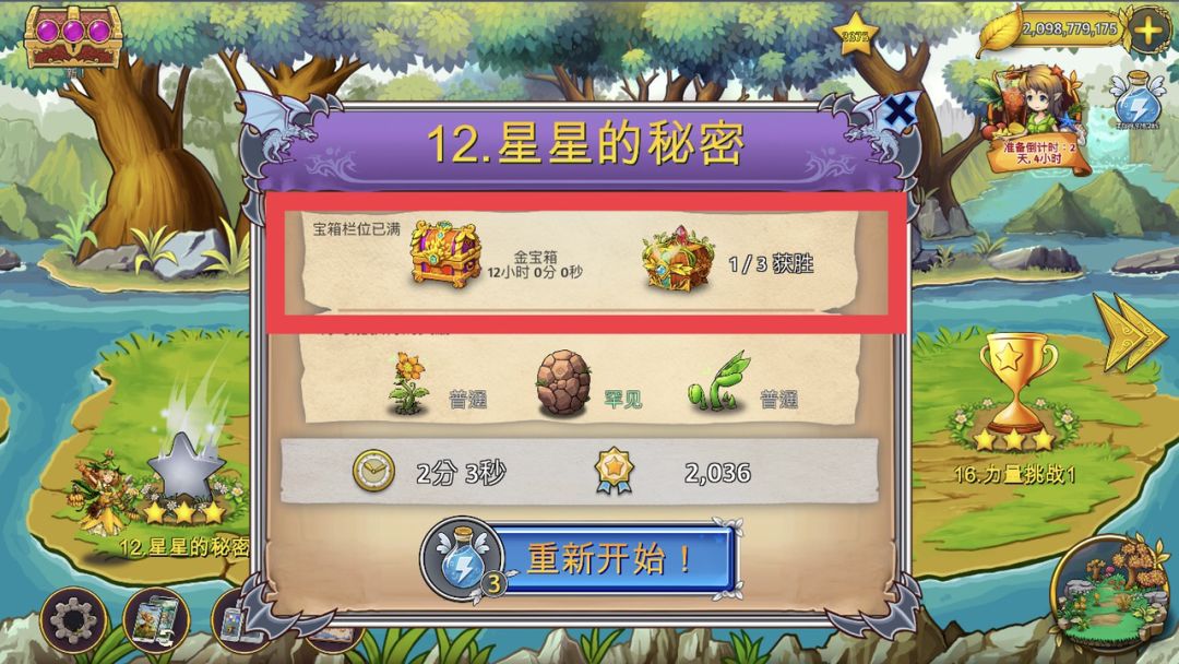 关卡通关之后,可以得到宝箱奖励,及其他物品奖励。左侧的宝箱每次通关都会有,出现在宝箱小屋,宝箱小屋没有空格则无法领取;右侧的宝箱通关相应次数后,随通关奖励一起在气泡里进家园领取。