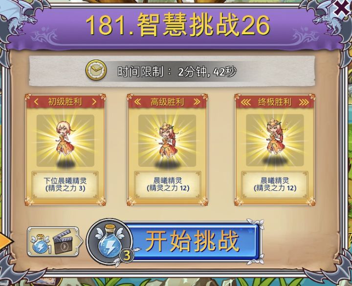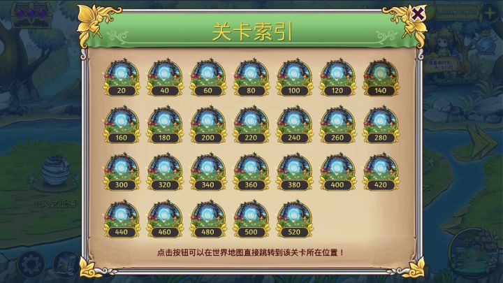 常规关卡也有快速索引,世界地图上左下角第四个图标,一个小地图,可以快速定位。挑战关卡有智慧挑战、力量挑战两类,要求限时完成三次,之后就和常规关卡一样不再限时。