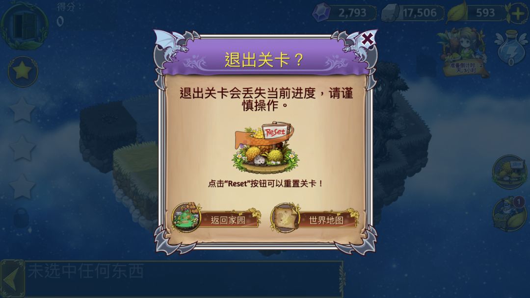 进入关卡地图之后,点击左上角的小门图标会出现退出关卡界面,如果要重置关卡,点击带箭头的reset即可;点击返回家园或者世界地图,则退出关卡不重置,继续需要花费更多精力点,且此时点击右下方的重置需要耗费1点精力,建议需要退出关卡的时候直接重置。
