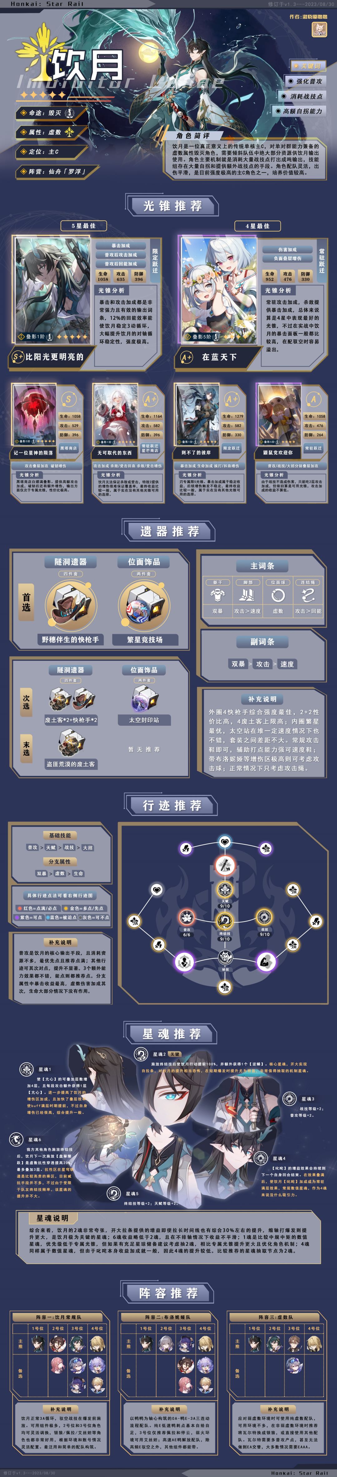 「比阳光更明亮的」:饮月专属限5光锥。暴击和攻击加成都是非常强力且有效的输出词条,12%的回能效率能使饮月稳定3动循环,大幅提升饮月的对轴循环稳定性,强度极高。