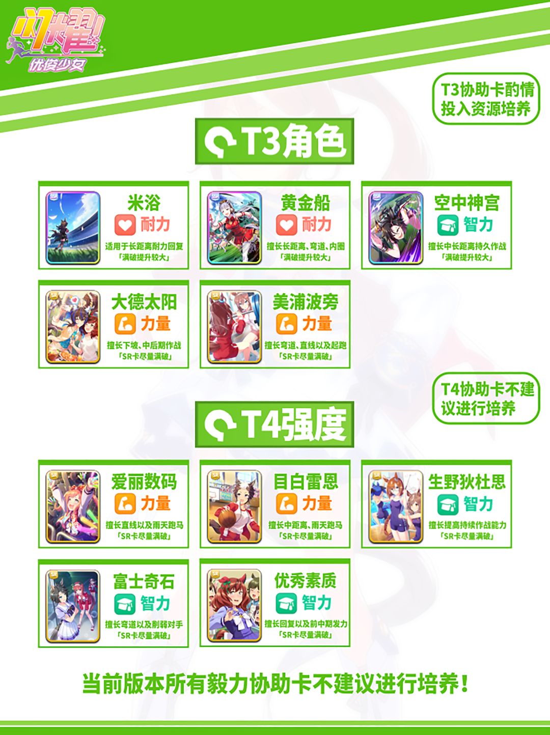 此榜单的排行参考了游戏的外服数据,在国服开服阶段建议大家把抽卡资源尽量投入到支援卡(原因在与初始卡池中没有比较强的马娘,而且在游戏中支援卡重要性比马娘大得多)。本榜单将角色分为以上几个梯度,具体请看图