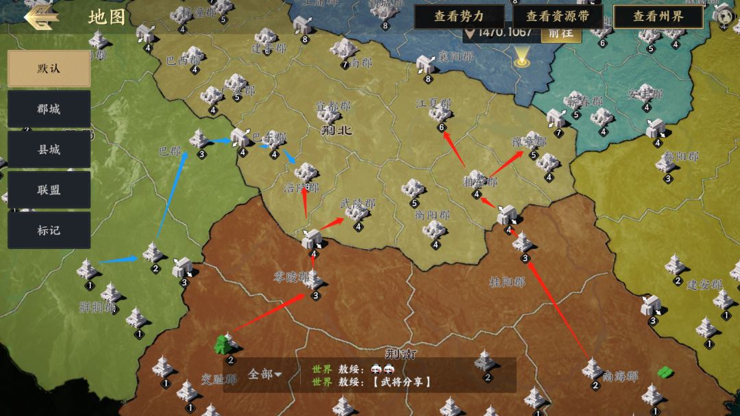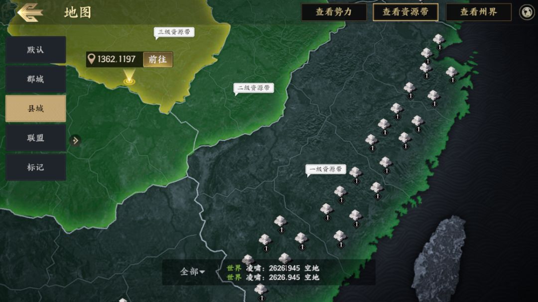 (2)二级资源州城池目标选择:每个1级资源州都有2个关隘通往2级资源州,以下图为例,靠左边的关隘与隔壁州的关隘非常接近,如果选择这条路线很容易与其他州的联盟爆发冲突,但也更靠近二级州的州府与龙气活动的大龙脉,是较为激进的选择;靠右边的关口则相对安全,可以在无人干扰的情况下先打下靠近本州的城池,再稳步发育进行扩张。需要注意的是,不同5级城有不同的进阶兵种,需要规划好路线在抢夺目标五级城上夺得先机。在出生州已经完成整合的情况下,主盟打左侧关口在前方打架,副盟打右侧关口在后方发育也是不错的选择。