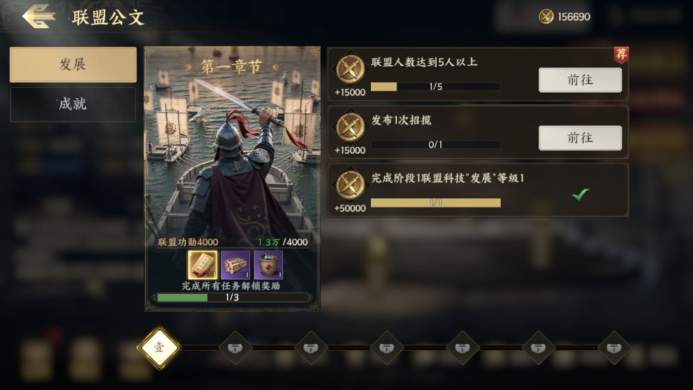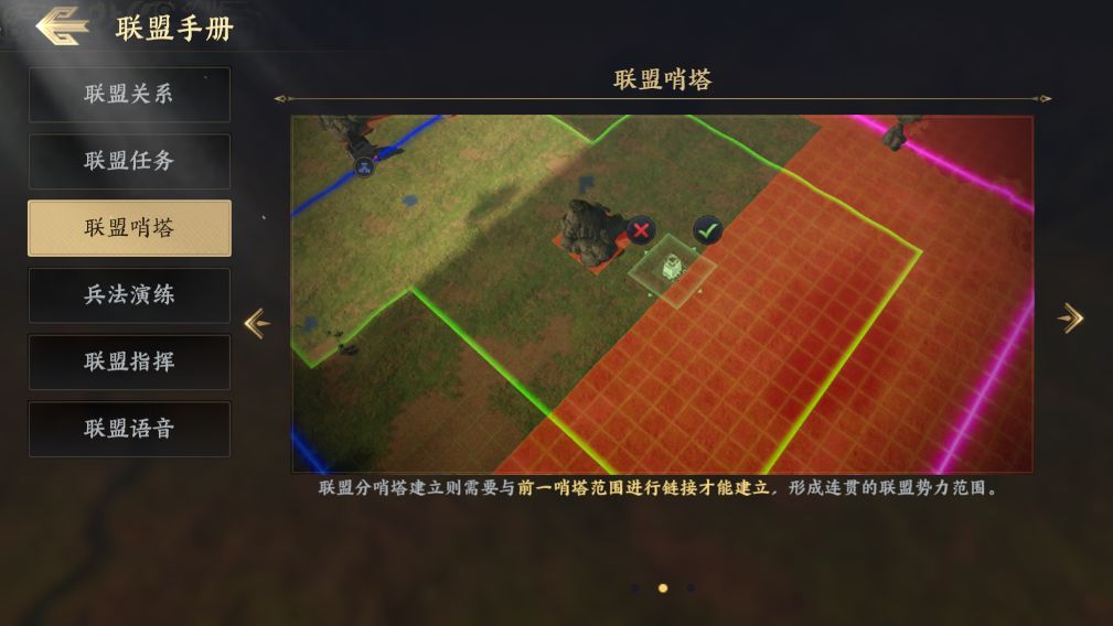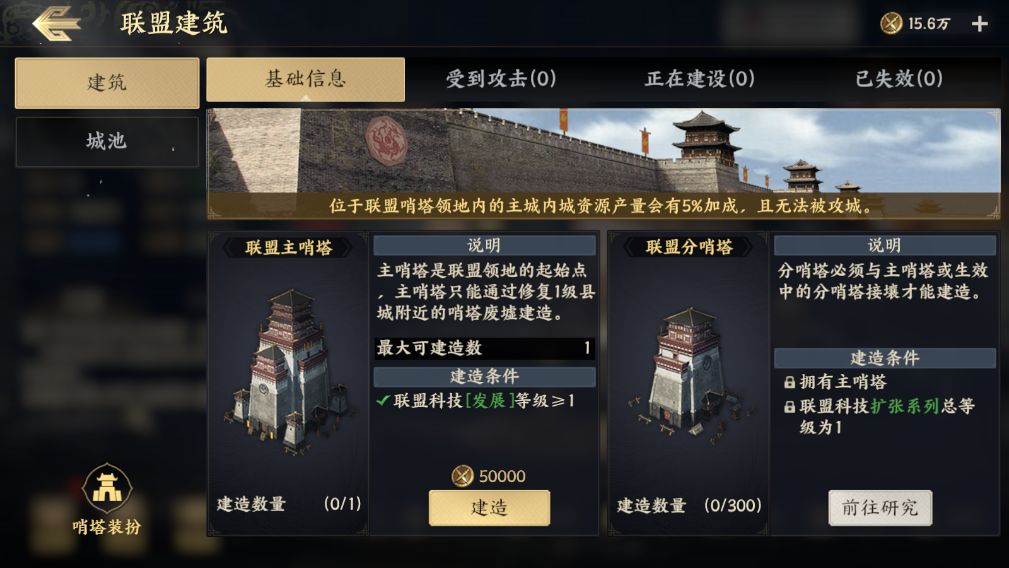 接下来到了筹备第一次攻城啦,盟主可以根据联盟公文的章节目标指引,带领大家完成各项任务获得大量联盟功勋,联盟功勋是由全联盟玩家共同获得并拥有的联盟资源,可以用于升级联盟科技、建造联盟哨塔。推荐主公优先升级【取士】科技来扩充联盟成员上限,升级【发展】科技后选择1级县城附近的哨塔废墟来建造主哨塔,因为只有哨塔范围与城池接壤的情况下,才可发起进攻,后续也可以通过升级【扩张】科技提升分哨塔的建造数量上限,从而不断扩张势力范围。在哨塔建造的过程中,可以呼吁盟友来哨塔附近拾取材料进行加速,成功加速后可以直接加快一倍建造速度,联盟成员参与加速还可以获得联盟币哦。