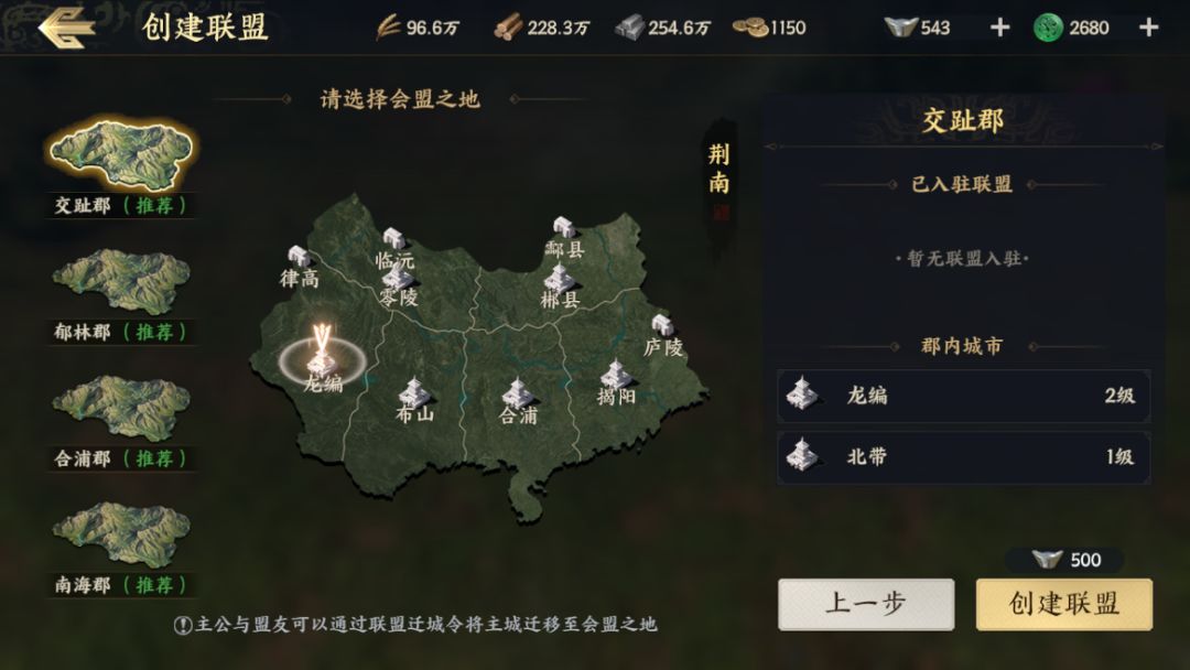 首先我们来了解一下联盟的创建过程吧,在完成主线任务第8回后即可解锁联盟系统,创建联盟的第一步是信息填写,包括联盟名称、联盟宣告、入盟条件、编辑旗帜。这里建议新成立的盟可以适当降低战力要求,广招各路玩家加入,等联盟人数扩充到一定程度再开始考核筛选也不迟哦,同时在旗帜编辑中也可以自定义各种旗面、花纹、图案等细节。第二步就是选择会盟之地了,这里可以根据系统推荐来进行优先选择,避免太多盟挤在一起,耽误了前期最宝贵的发育时间。