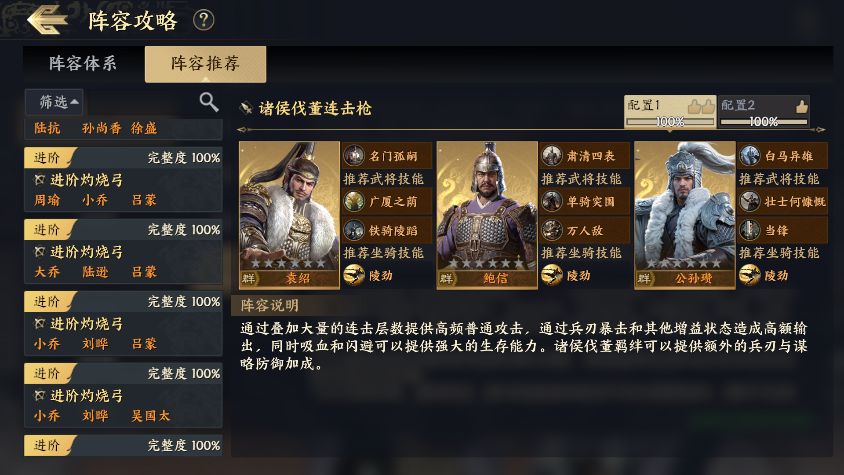 袁绍:名门孤嗣(获得闪避状态,若己方存在倒戈状态,额外获得暴击效果)+广厦之荫(获得6层连击效果)+铁骑陵蹈(获得暴击效果)鲍信:肃清四表(战斗开始后获得倒戈状态,持续6回合)+单骑突围(获得3层连击效果,并降低敌方兵刃防御)+万人敌(6回合后获得倒戈状态,一直持续)公孙瓒:白马异雄(降低受到的兵刃与谋略伤害,若己方部曲为枪兵或骑兵,提升兵刃伤害)+壮士何慷慨(获得2层连击效果,提升敌方受到的兵刃伤害)+当锋(获得暴伤效果,提升兵刃攻击)