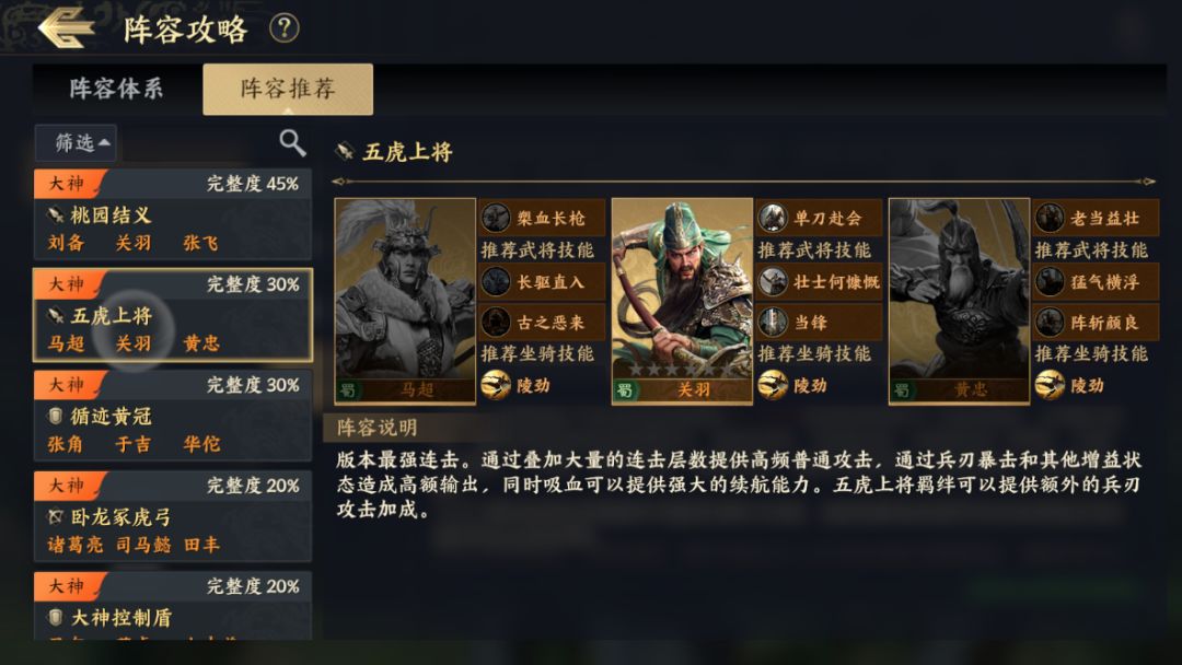 高配连击枪,当前版本最强连击体系,由情怀满满的五虎上将羁绊组成,且关羽、马超、黄忠自带技能均与连击、暴击状态相关,与输出阵容定位完全契合。因此该阵容主要通过连击实现高频的普通攻击,并通过暴击、暴伤、增伤减防、羁绊效果等BUFF最大化输出效果,同时闪避、倒戈等效果保证一定生存能力,属于稳定输出和续航兼顾的优秀阵容。