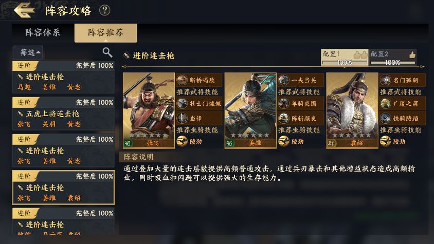 进阶连击枪,在没有羁绊的情况下依然很强,并且3个武将在前期都可以快速获取,其中袁绍可以通过威望提升到5级免费获取,张飞可通过首充活动获取,姜维在累充活动中第二档获取。这套阵容也是标准的连击队构筑思路,姜维负责提供核心的连击效果,张飞的连击与倒戈提供续航;袁绍提供闪避、加强生存能力。