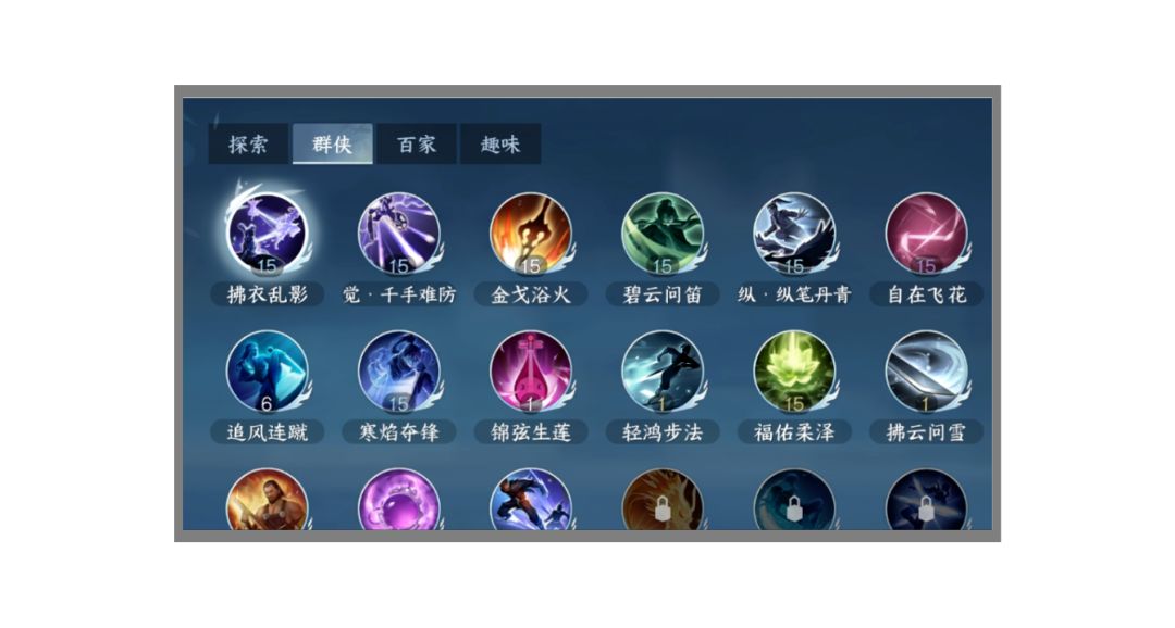 11)轻鸿步法:寻访群侠习得;抽到叶构就自动习得技能。12)福佑柔泽:寻访群侠习得;抽到柔福就自动习得技能。13)拂云问雪:寻访群侠习得;抽到檀沁就自动习得技能。14)例无虚发:寻访群侠习得;抽到阮明正就自动习得技能。15)兵锋现世:寻访群侠习得;抽到唐铸就自动习得技能。16)明鉴护心:寻访群侠习得;抽到林霁就自动习得技能。17)万化纵游:侠缘达到【知心着意】好感度达2451或者侠友达到【知心着意】好感度达2451,然后在菜单-收藏-万象-好感中领取万化纵游。18)觉.炎龙破渊:完成方承意觉醒任务后习得;方承意好感度达到【情深意重】之后才能进行觉醒。19)觉.倒醉乾坤:完成追命觉醒任务后习得;追命好感度达到【情深意重】之后才能进行觉醒。20)觉.一剑无迹:完成冷血觉醒任务后可以学习;冷血好感度达到【情深意重】之后才能进行觉醒。21)不动禅心:寻访群侠习得;抽到铁手就自动习得技能。22)觉.崩峦贯阙:完成铁手觉醒任务后习得;铁手好感度达到【知心着意】之后才能进行觉醒。23)霜天幽影:抽到群侠【燕无归/花将离】可以获得技能!24)觉.凛夜飒雪:完成【燕无归/花将离】觉醒任务后习得;【燕无归/花将离】好感度达到【知心着意】之后才能进行觉醒。25)萌虎出击:寻访群侠习得;抽到阮阮就自动习得技能。