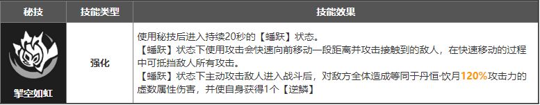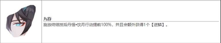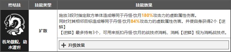 扩散型输出大招,倍率一般。主要是在施放完后会给饮月君2个【逆鳞】,这被动存在时会抵消饮月君的战技点消耗,帮饮月君更无脑施放强化普攻。但在零魂状态下大招只给2个逆鳞,想放完大招无脑接3级强化得抽命座。