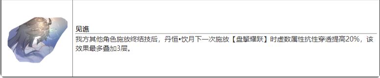 3级强化:盘拏耀跃:高倍率扩散伤害,造成7段伤害,吃满战机被动。能量恢复是40点,饮月君的主要输出来源。在满命情况下,伤害会来到650%,跟神君就差10%,可以说他自己就是个神君也不为过。