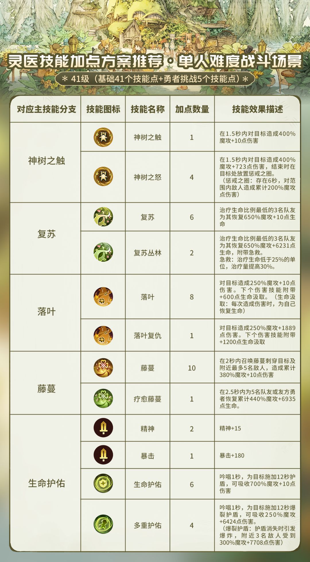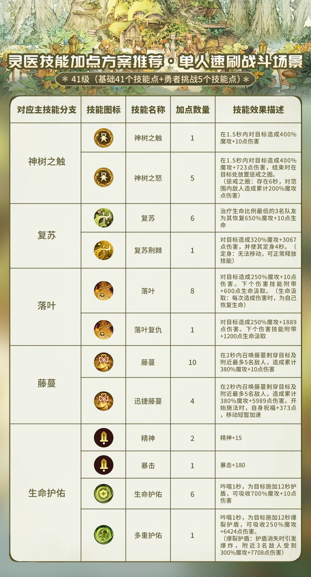 灵医通常需要准备两套技能方案,一套全奶方案,用于团队合作玩法,如装备副本、组队PK、骑士团团战;另一套输出方案,用于单人挑战玩法,如阿奇古塔、勇者挑战等。除上述两套基础方案外,还可以尝试进阶的半输出半辅助方案,用于比较困难的个人作战场景;