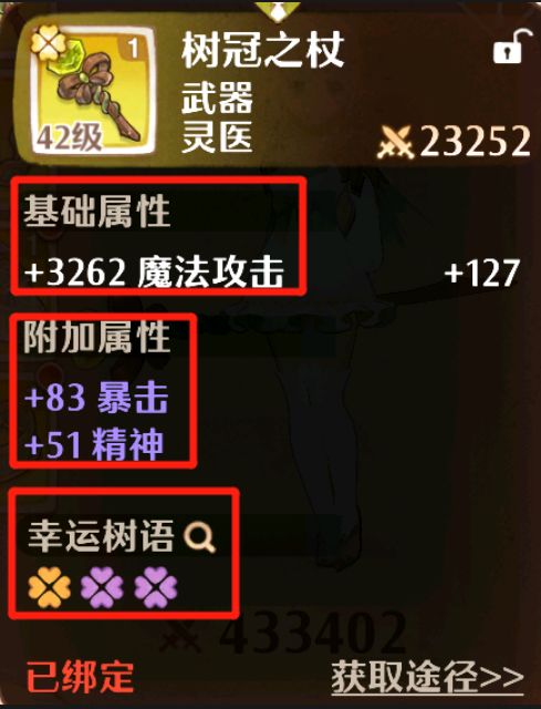 3)幸运树语可通过树语互换更改,通过鉴定金装概率产出,优先选择战力评分提升较高的树语,战力评分相近的情况下,推荐:精神>攻击力>急速暴击>生命值=防御>格挡>其他;