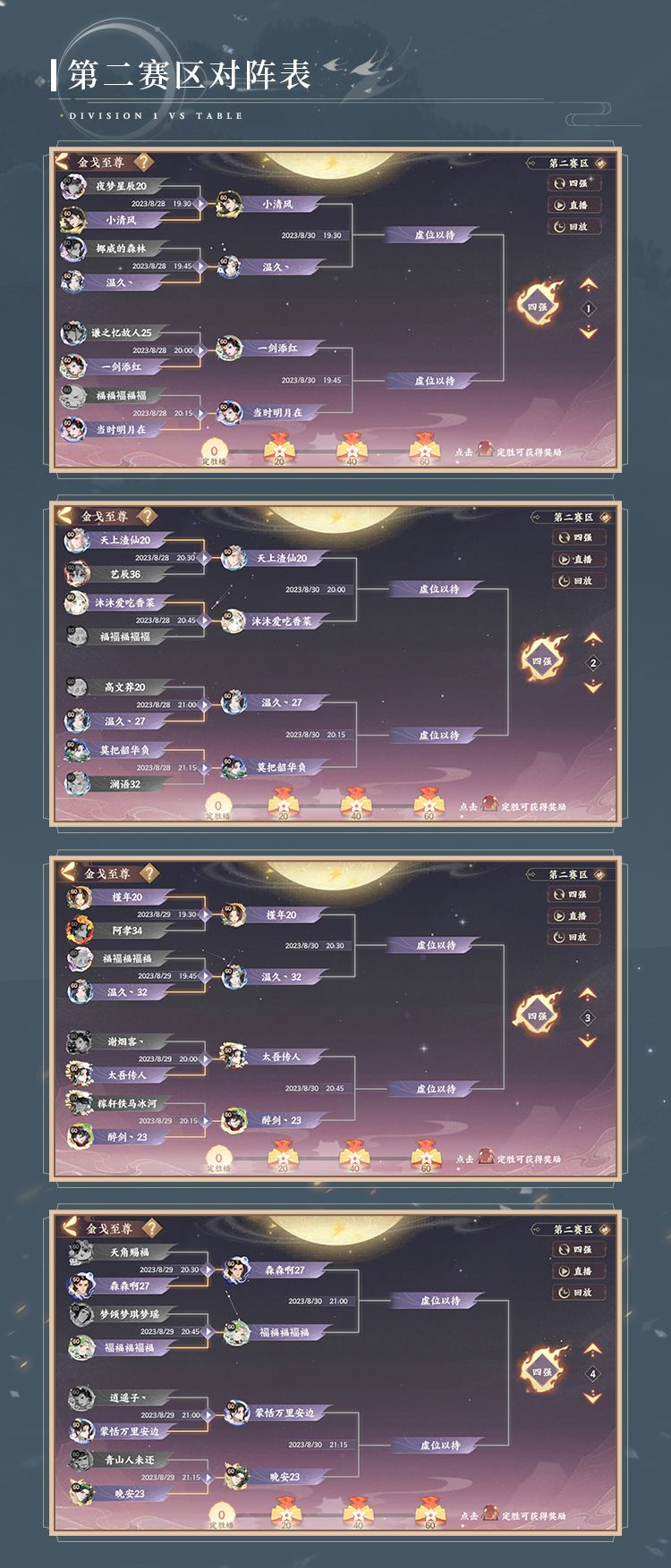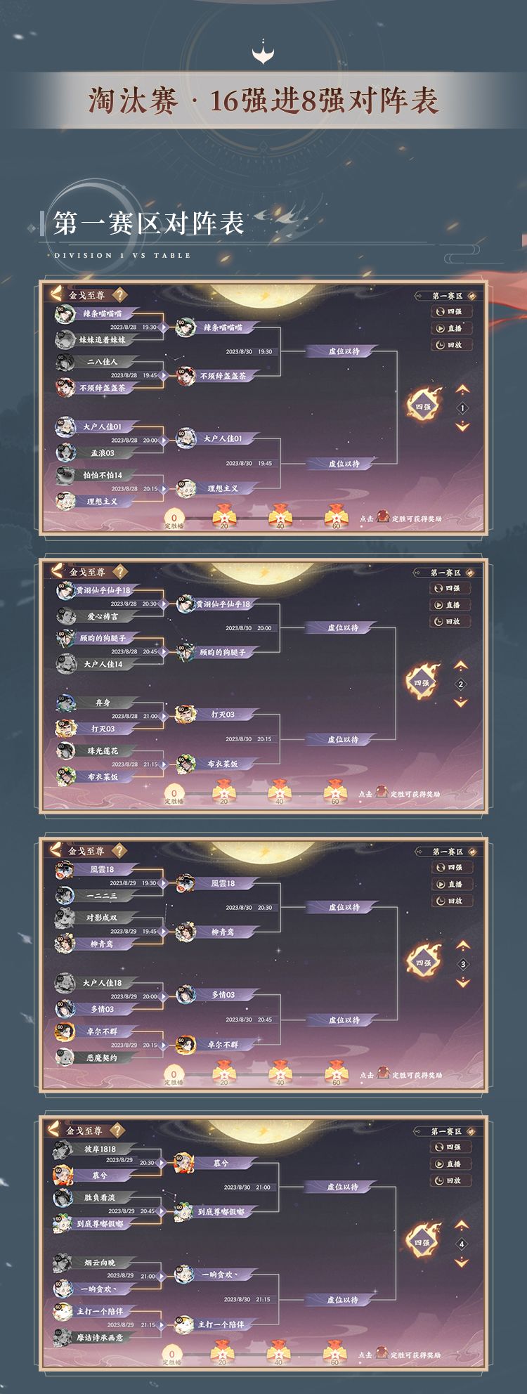 小麒麟高亮提示:第七届金戈至尊淘汰赛于8月28日-9月1日,每天19:30-21:30进行,使君大人可以通过游戏内赛事页面的直播入口或锁定B站官方直播间【忘川驻现世电台】观看直播~同时,不要忘了在超话中带话题给自己支持的选手打CALL赢取限定周边奖励哦。