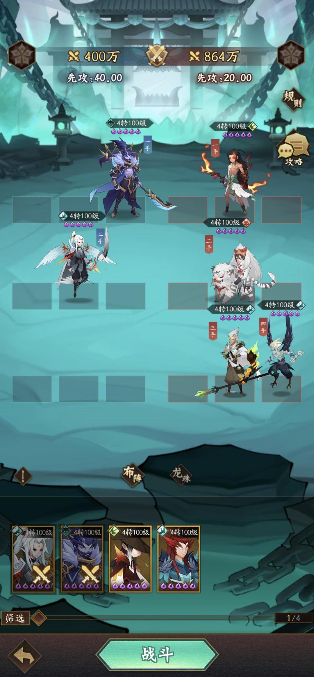1、利用五道将军横排战法先打残敌方,再利用飞卫无限战法秒掉对手,顺利通关