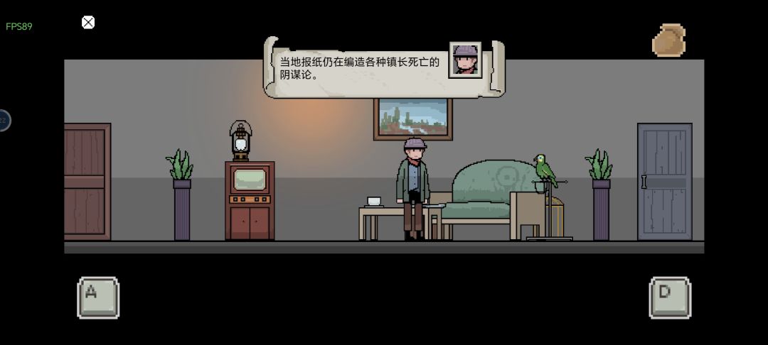 然后从卧室出门,来到客厅,客厅从左到右有一台电视机,电视机上有煤油灯(重要道具),然后是桌子,桌子上有咖啡和报纸(剧情介绍),桌子后面挡住的就是行李箱,然后是沙发,到鹦鹉,在最右边就是浴室(如果你没有点击行李箱,是不能够进到浴室里的)