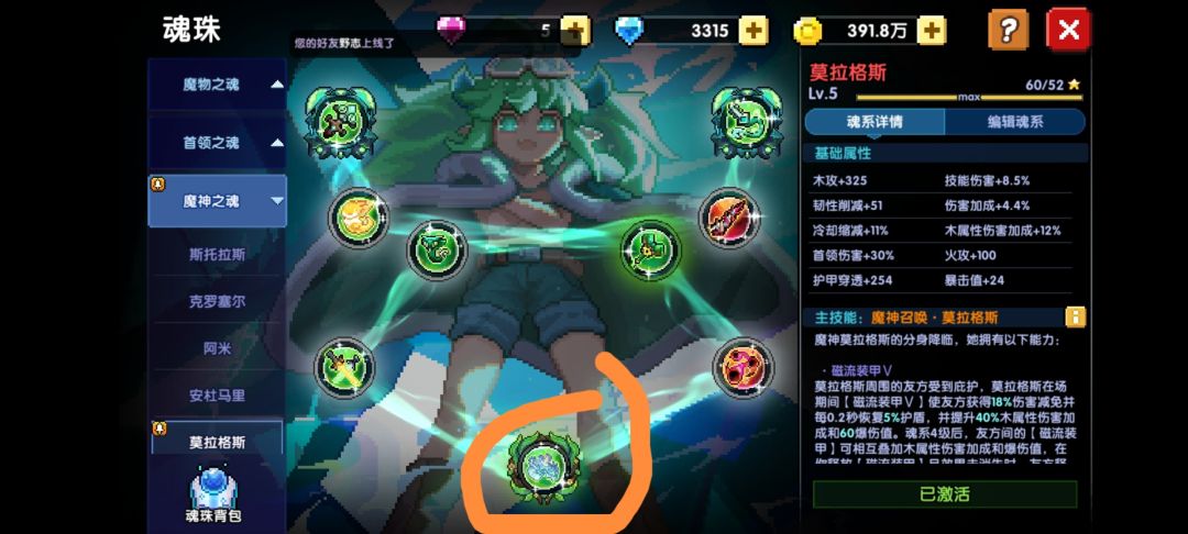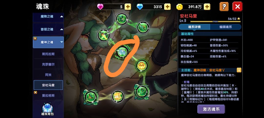 小莫/安度魂系都可,安度魂系较优,若凑不满5级魂系可以用小莫凑魂系,能凑满选择安度,记得把魂珠插入圈内位置,否则职业魂珠效果不生效(打出的技能是出现花而不是爆炸效果)