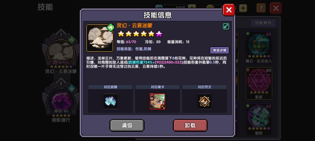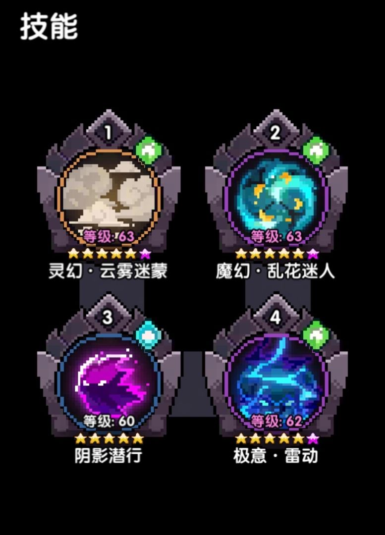 可以看到紫技能是增益技能,橙技能是我们的输出手段,并且,橙技能打的是技能伤害,所以我们要叠技能伤害,剩余两个技能带阴影+雷动