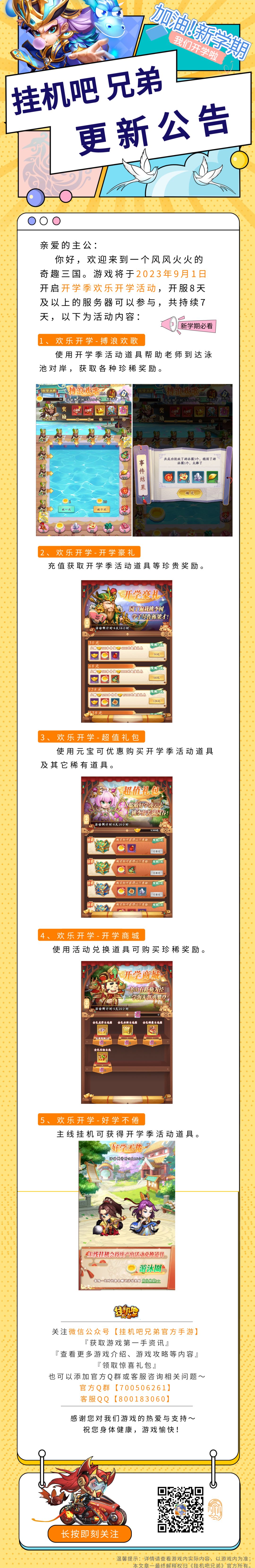 你好,欢迎来到一个风风火火的奇趣三国。游戏将于2023年9月1日开启开学季欢乐开学活动,开服8天及以上的服务器可以参与,以下为活动内容: