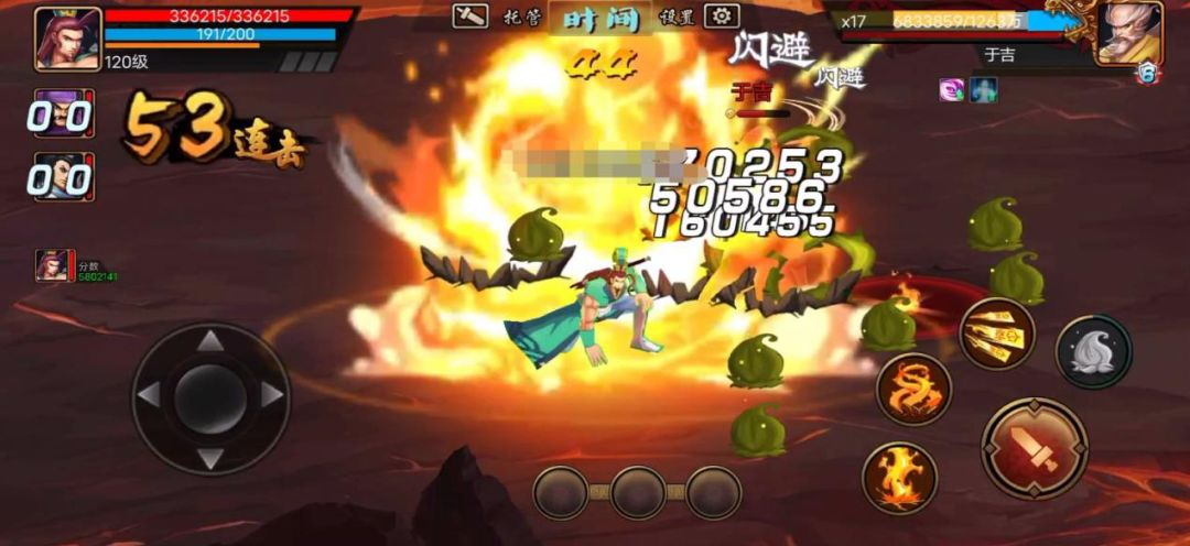 注意避免和于吉正面接触,于吉放冰、变动物,蔡文姬一技能规避,其他武将可以放黄石公或者张陵剑卡无敌。于吉放全屏火书之前可以跑到中间或最上、最下的位置,烧不到,但他会追下来,这时看自身血量来选择,是硬扛还是用技能或道具规避险况。