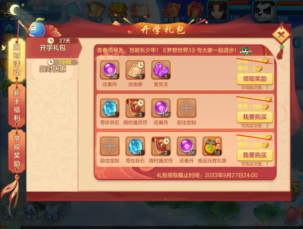 8月31日维护后至9月27日24:00,服务器等级≥50级的玩家可前往奖励界面领取开学礼包。