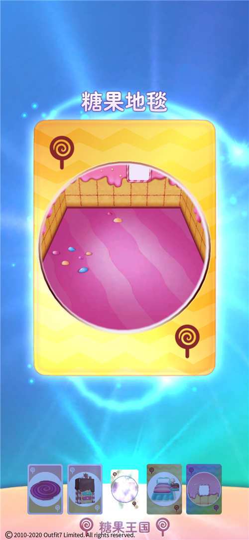 首先我们能看到汤姆猫的脚下有一排共五个选项。第一个是大厅,大厅是汤姆猫玩乐的地方。第二个是厨房,厨房是给汤姆猫喂食物的地方。第三个是厕所,是给汤姆猫洗澡和上厕所的地方。第四个是卧室,是给汤姆猫睡觉和换衣服的地方。第五个是飞行室,是汤姆猫起飞和换宠物的地方。