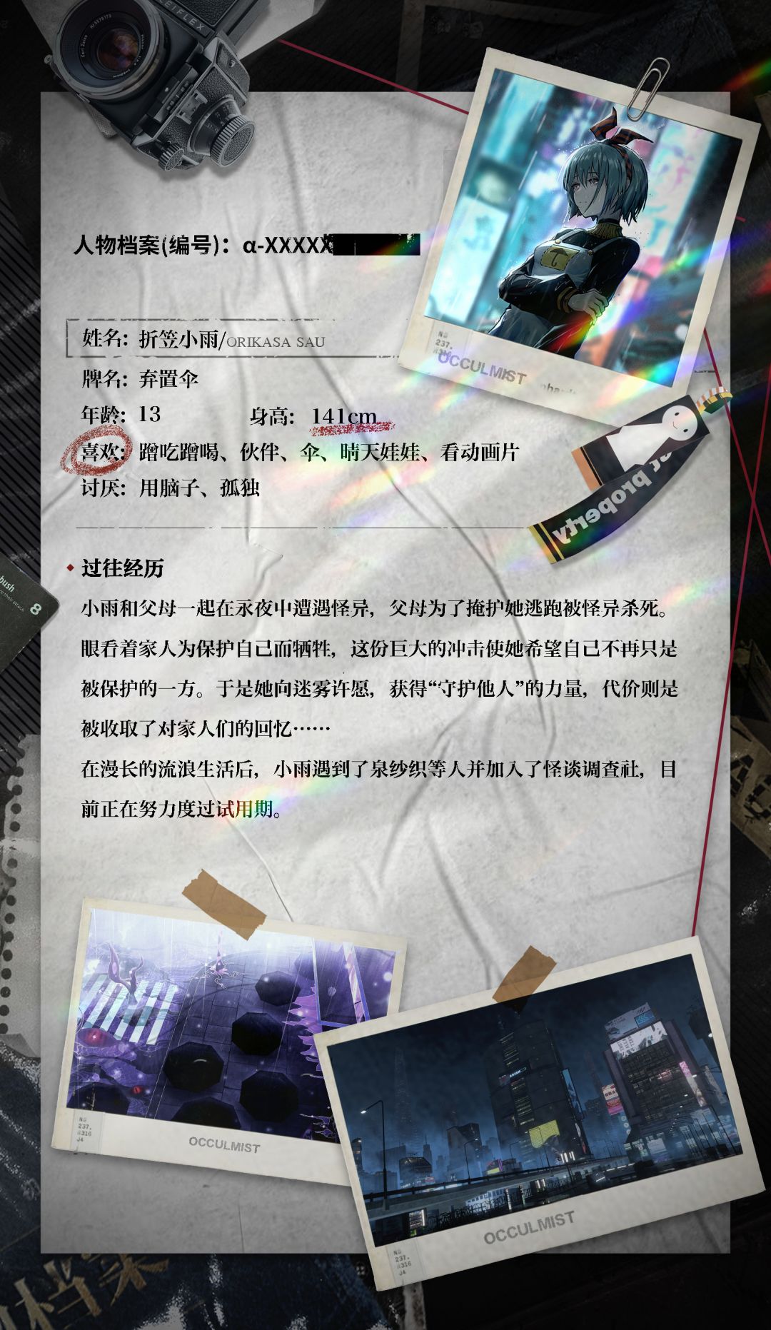 眼看着家人为保护自己而牺牲,这份巨大的冲击使她希望自己不再只是被保护的一方。于是她向迷雾许愿,获得“守护他人”的力量,代价则是被收取了对家人们的回忆……在漫长的流浪生活后,小雨遇到了泉纱织等人并加入了怪谈调查社,目前正在努力度过试用期