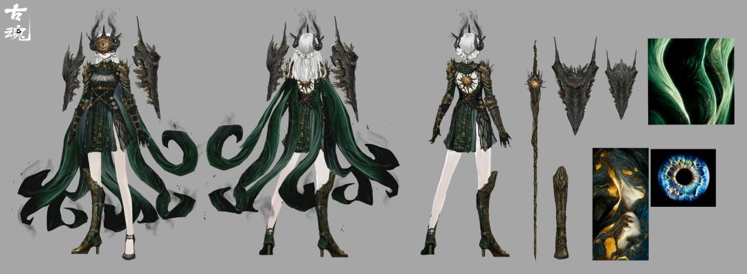 设计灵感:躯体被吞噬,被誉为“魔物之王”的卡奥斯,穿着一身银色铠甲,背后却有一对像是本应该属于天使的翅膀,象征着光与暗的冲突,天使与恶魔的对立。铠甲下的卡奥斯,给人以深渊凝视质感,死神兜帽掩盖了他所有的神态表情——他就是黑暗本身,是黑暗之主,是暗夜收割他人灵魂的死神。他手中的镰刀则是由世界树枯枝打造而成,镰刀上缠绕的绿色丝线,像流动着毒液的血管一般,散发着猎杀者的气息。这样充满矛盾的时装,不知道合不合各位的胃口呢?
