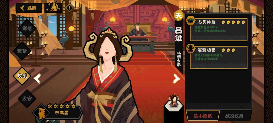 1,前期需要丞相找城市寻访拿星,等候时间萧何吕雉还能“坑”些名臣回来。如果被攻击,还有军策跟萧何帮忙,只是发育时间有点长。