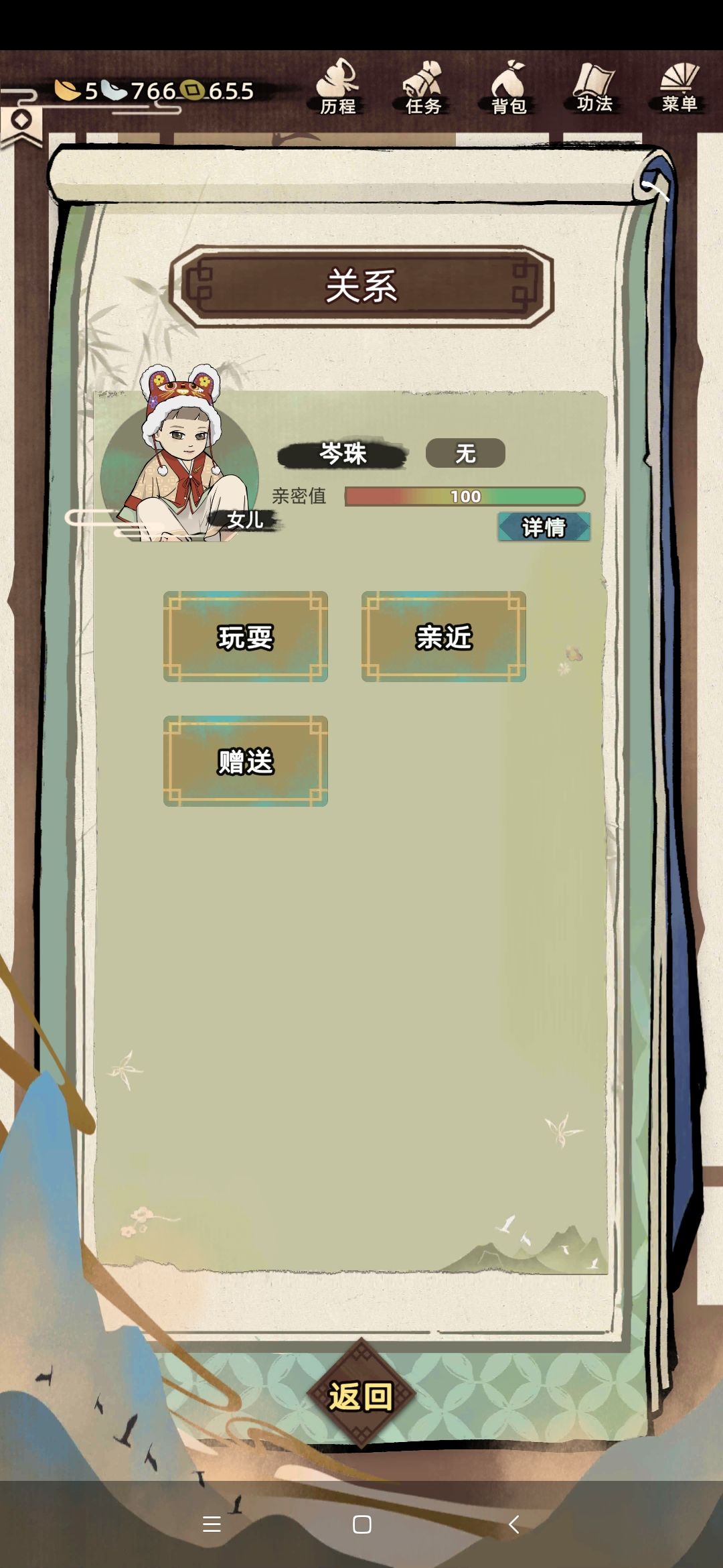 后来成年了,妈妈催我相亲,我也答应了认识那位仁兄,但奈何我心在江湖,想无拘无束,做个侠女,也一直没同他们聊天,媒婆也给我许了两次亲,我也婉拒了。直到我老公出现,他是我朋友里面最帅的,虽然修为不是特别高,但是样子太好看了,奈何我是个颜控,我就夸夸跟他聊天,后面他表了白,我们就在一起了,在一起几年都没结婚,我着急了,我催他下聘,我担心再不结婚,娃都生不下来,后面他给了好多聘金,我跟他也正式成为了夫妻,没几年,就生下了我的女娃,长得贼乖巧,随我老公姓,取名岑珠,意为是我家的掌上明珠,然后又没几年,我又生了个女娃,这次随我性,取名凤心悦,我是想她的生活都能开心和喜悦,虽然我知道我不能再无拘无束了,但是看着他们一天天长大,心里也很开心,就让我来为她们遮风挡雨吧。
