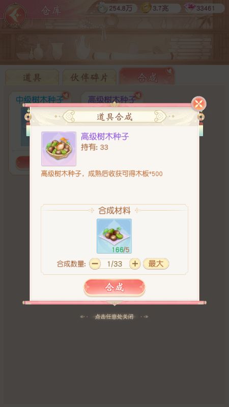 在农场还可使用【合成】功能,将初级树木种子合成为中级树木种子,或将中级树木种子合成为高级树木种子。