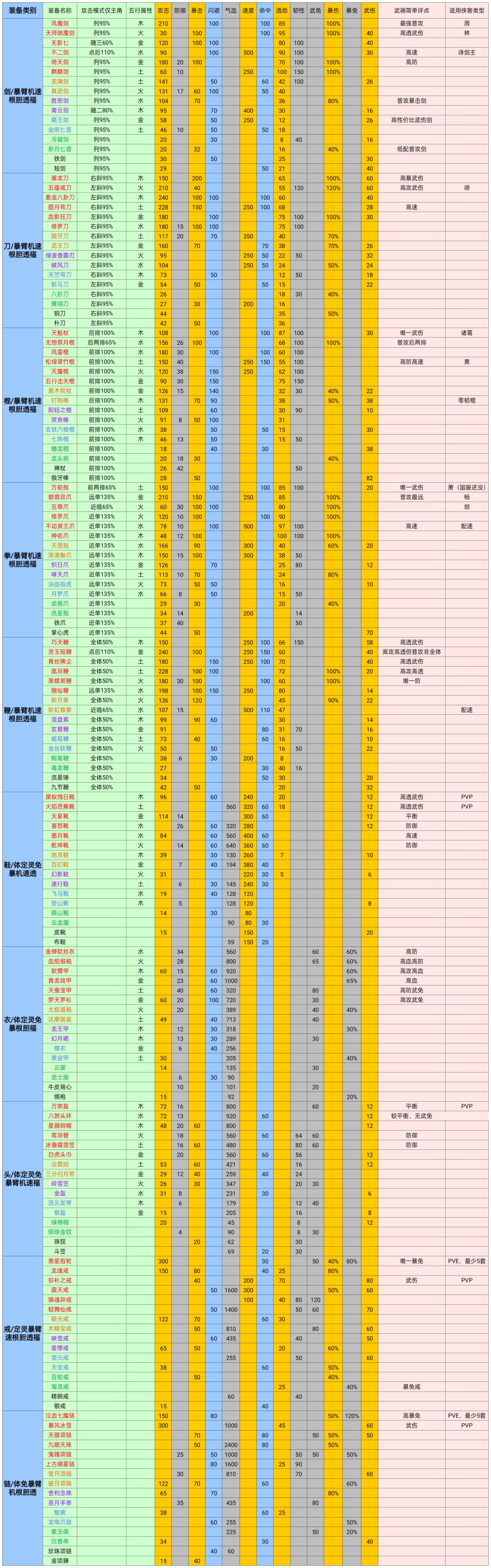 不想更辣)文档是dc上大佬一年前发的,经过版本更新数据改变了,我对常用装备进行校对修改,并更换属性列的顺序与游戏内一致,每列颜色也作了区分,以便查找。