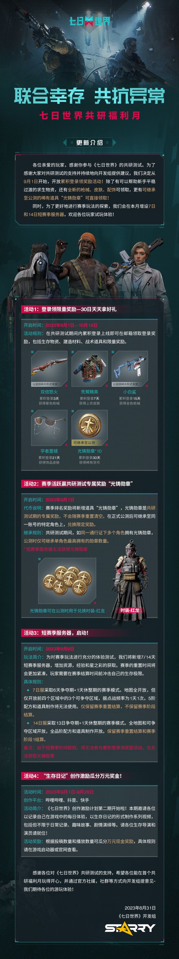 亲爱的玩家,感谢您参与《七日世界》的共研测试,《七日世界》将于9月1日迎来首个福利月大更新!玩家将可通过签到获得海量奖励,包括测试服新手期过渡物资和可继承至公测的特殊奖励。同时我们在结合了玩家的对赛季玩法的建议后,决定将在本月增设全新的7日和14日短赛季服务器,为玩家提供更多游戏选择。详细内容可以点击长图进行查看,欢迎各位玩家试玩体验!