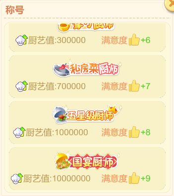 其次就是小主们的一个厨师称号啦,不同的厨师称号能让小主获得更多的好评,用更精湛的厨艺去征服口味挑剔的顾客,每做一道菜都会有相对于的厨艺值,比较难的菜品厨艺值会更高,所以各位小主要多多做菜,争取早日到达厨艺巅峰,让餐馆越做越红火!