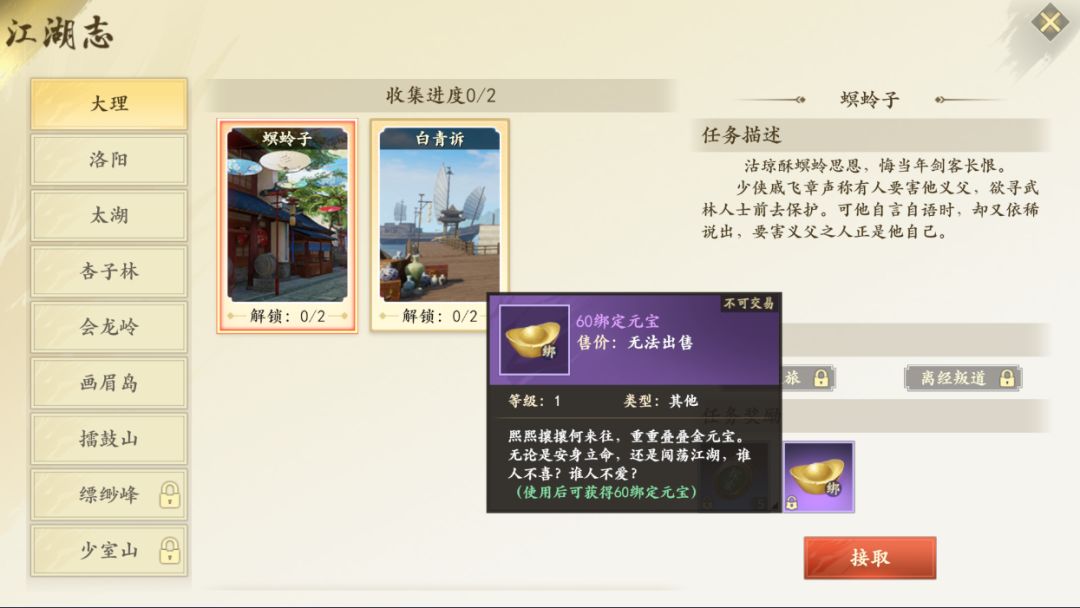 探索功能包括:山河影、名人谱、美食荟、萌宠集、万卷录、江湖志和奇缘记。除江湖志和奇缘记以外其他几个全部都是跑图就可以白捡的绑元,每完成一个奖励5点元宝;江湖志每张地图可以完成四个任务,完成这些每张地图就可以拿到将近650的绑元呐~!至于奇缘记嘛~顾名思义是要靠部分运气的拉~奇缘分三种,蓝色,紫色,橙色。蓝色触发几率为100%,而紫色和橙色在满足天气,时辰,触发动作的基础上还有10%~20%的触发几率才能触发。不过没关系每天去摸一摸总能触发的!奇缘的奖励也是更加的丰厚!