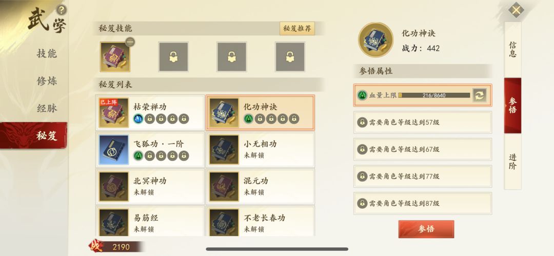 ⑴ 秘笈参悟:已经解锁的秘籍在角色达到15、48、61、71、81级时分别开放一条参悟栏。参悟属性随机,不满意可以消耗洗尘珠进行转换,换成自己想要的属性后继续消耗洗尘珠进行属性参悟,目前共24本秘籍其中12本秘籍可选择攻击类型的参悟属性,12本秘籍可以选择防御类型的参悟属性。洗尘珠的获取途径为聚贤庄副本、挑战聚贤庄副本、至尊之战以及团本剑荡阴山。注:同一本秘籍相同的参悟属性只能存在1个。