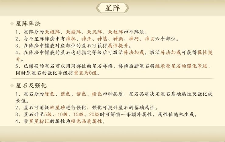 63级会开放星阵玩法,共分为四个阵;开启等级分别为63级、73级、83级、93级,每个阵可以镶嵌六个不同部位的星石,获得星石属性,每个阵法中的星石均达到5、10、15、20、25级后可激活不同的阵法加成效果。星石的基础属性及高级属性皆为随机出现,当获得更适合自己的星石时可直接替换原有星石,星石的等级会自动继承至新的星石上。星石可在帮会珍宝阁、逍遥谷、挑战逍遥谷及团本剑荡阴山中获得