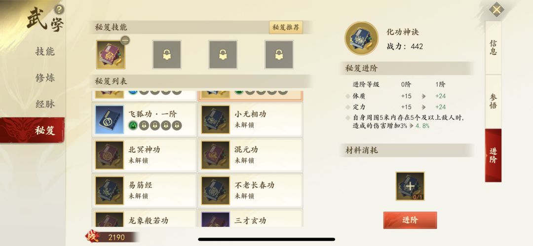 ⑵ 秘笈进阶:每本秘籍都拥有强大的秘籍属性以及上阵技能,少侠可优先选择需要上阵的秘籍进行进阶以获得更强的技能属性加成。秘笈需要同种秘笈进行进阶,秘笈的获取途径为橙色秘笈:帮会珍宝阁、挑战聚贤庄副本、至尊之战;紫色和蓝色秘笈可在商会、挑战聚贤庄副本、聚贤庄副本和至尊之战中获得。