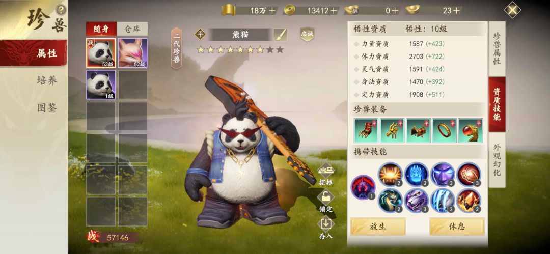 ⑵ 悟性:为珍兽提升悟性等级所带来的战力收益也是相当之高,但是悟性等级的提升更多的是要凭借运气了,注意二代珍兽等级需达到45级方可提升悟性。悟性0-3级需要使用初级根骨丹进行悟性提升,4-6级需使用中级根骨丹,7-9级需使用高级根骨丹,9-10级只能使用特级根骨丹,若悟性提升失败,将保留悟性等级,不会降级。根骨丹的获取途径有:商城、万灵石商店、玄武宝藏、华山论剑、寻龙分金等。