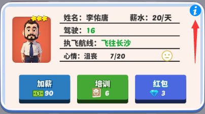 机组成员(机长和空姐)初始心情值20点,每次执飞航班会减1点心情,心情接近0就会心态崩溃