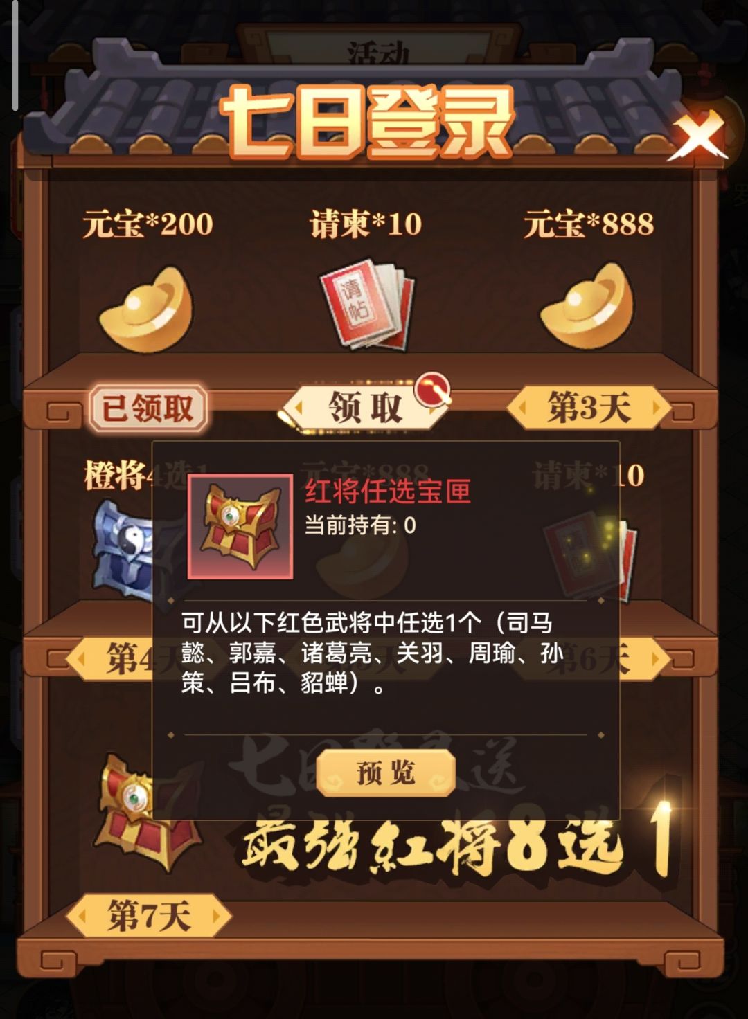 领取途径:12级完成对应主线任务解锁活动后,游戏内右上角 - 活动 - 三国福利 - 七日登陆