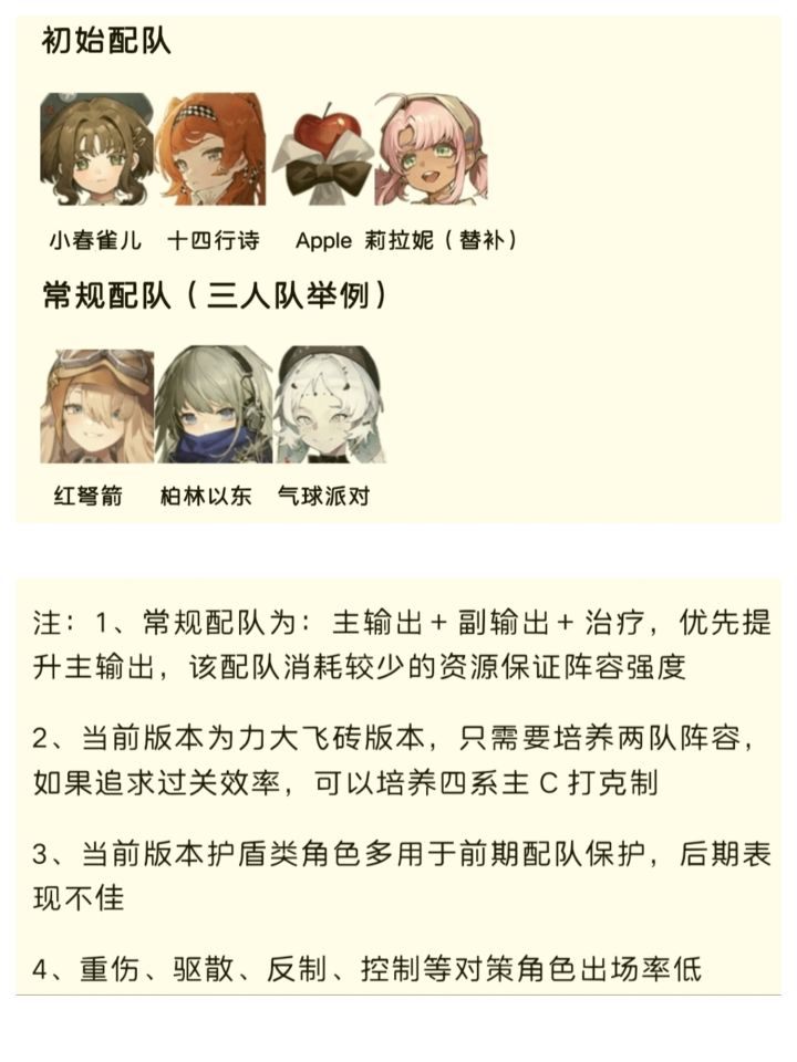 ●前期优先练主线剧情赠送的初始队伍:小春雀儿+十四行诗+Apple+莉拉妮,升级到洞悉一1级后,完成“故事的最初”新手任务,利用奖励的大量升级材料,拉后续的主体队伍,这些材料足够主体队伍升级成型,而原先的初始队伍(除十四行诗外)就不用再升级。