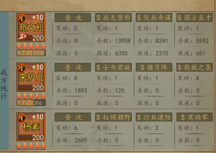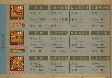 4、三才苏威骑:重点来了、这个是本人最近研发的、苏威+杜+李世民(打武力队好用)或者郭子仪(打智力队好用)。 重点就是带大军 目前是我用着最舒服的队伍、大军提供负面状态、三才提高苏威技能的发动记录、那妥妥的人头收割机、除了怕房枪、打爆头一点都不虚。