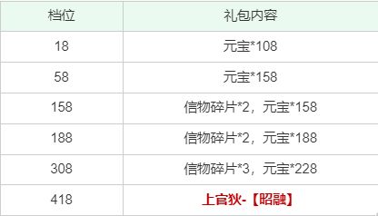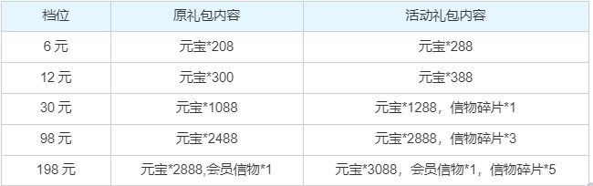 【活动内容】单充礼包元宝加量,部分材料添加