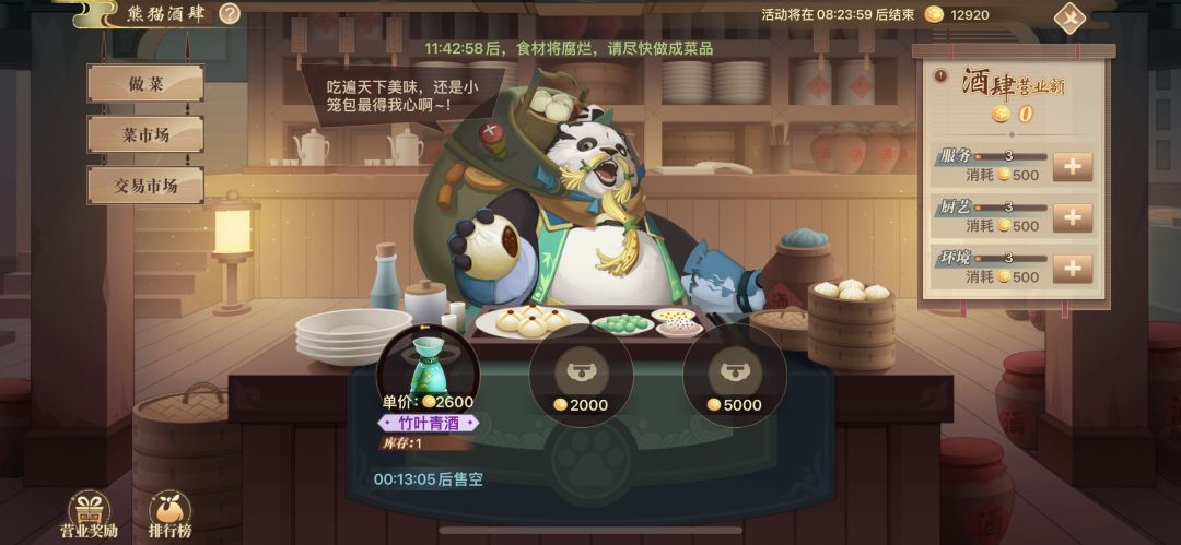 3、「熊猫酒肆」熊猫酒肆今日开张!快来帮助熊猫食神经营食肆,制作美食累积营业额,更有天法神符碎片、天法仙符碎片、活动伙伴碎片自选包等好礼等你来拿!
