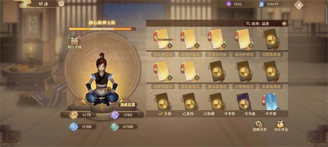 4、激活/升级/参悟功法书均可提升对应功法书的修行经验,根据修行经验可解锁修行奖励。