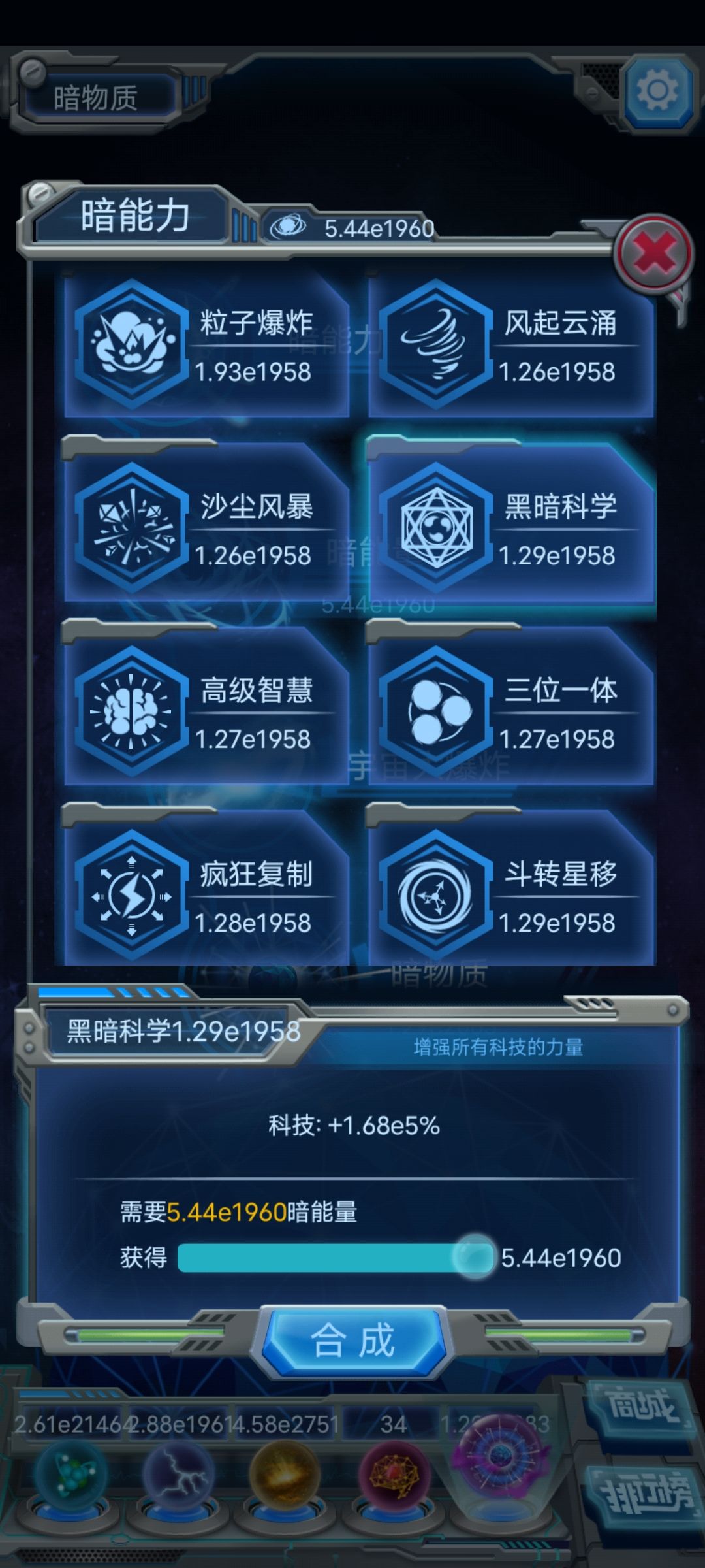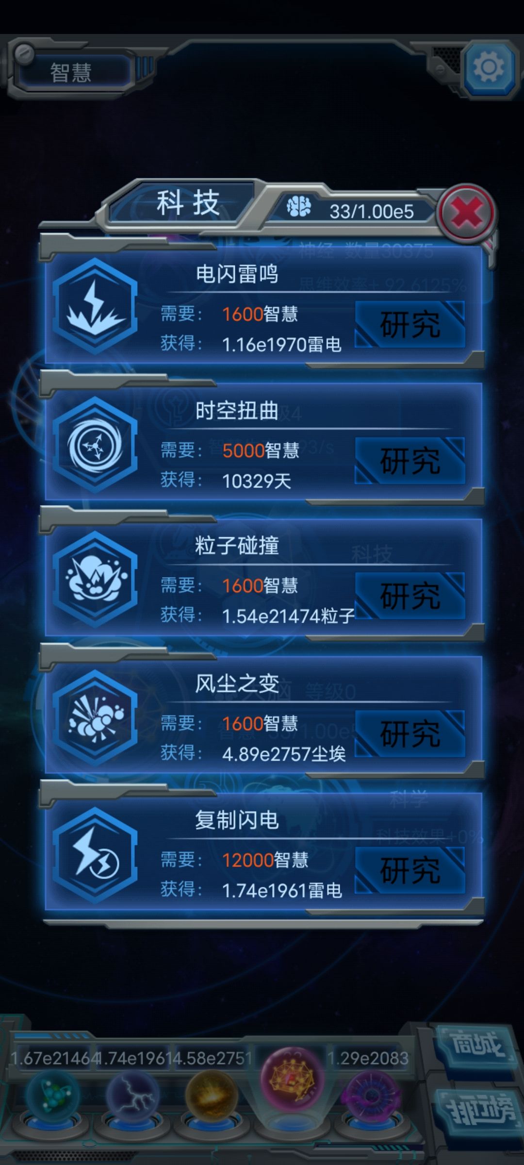 因为账号最后的极限数据已经不可能冲入榜前 所以我彻底不在乎数据了 前11炸不点科学 刚近似到最低爆炸需求就屯智慧开炸 平均炸一次4-6天 11炸后也只点100-1000科学 一周左右可以完成一次爆炸(不过15炸以后的几次爆炸比较慢慢 18炸完花了370w智慧才进行19炸 用了大概一个月也是唯一 一次点了50000神经5000科学 大脑后期纳米增幅 19炸5.98e5智慧的需求需要点80000级大脑)