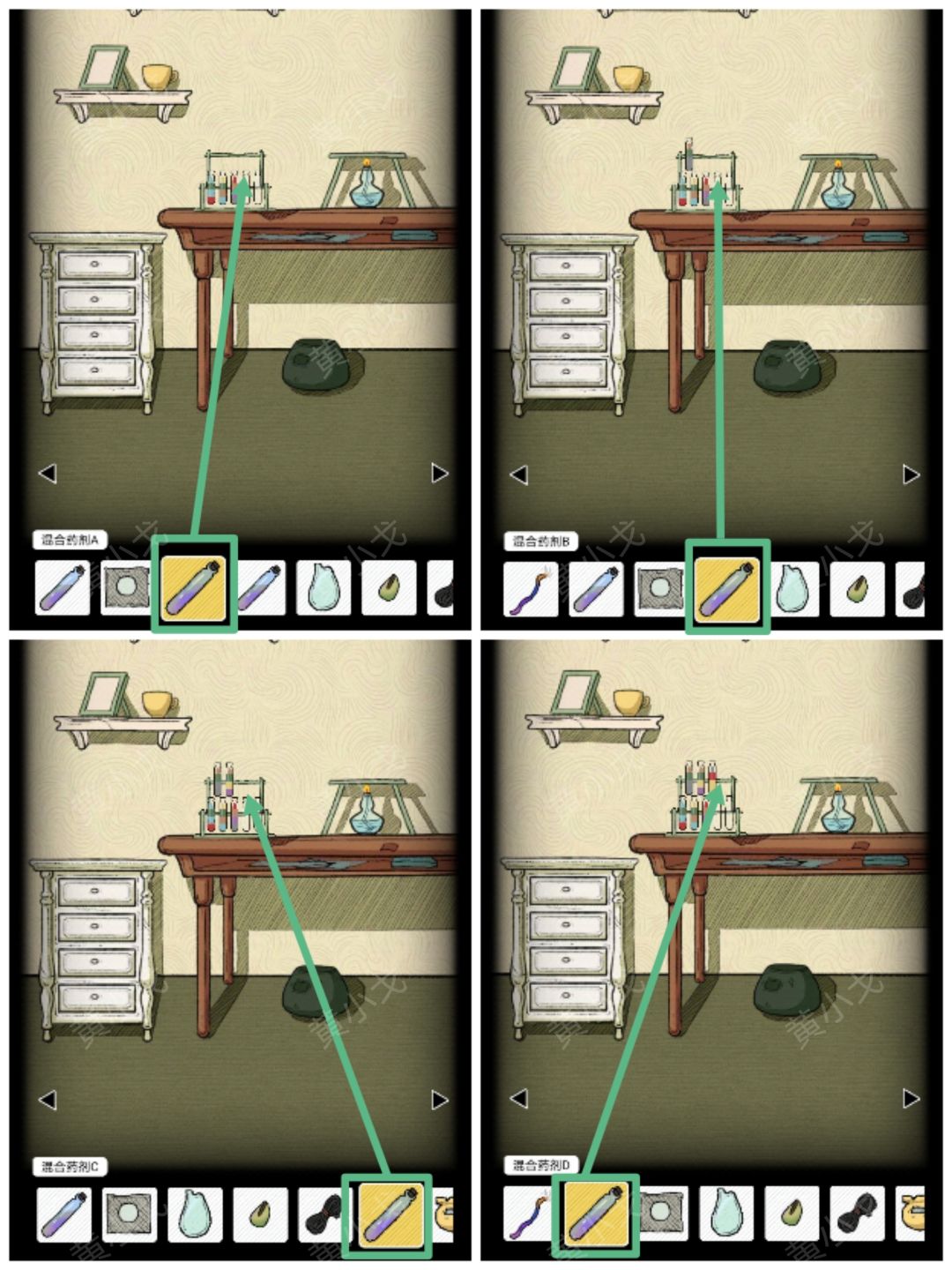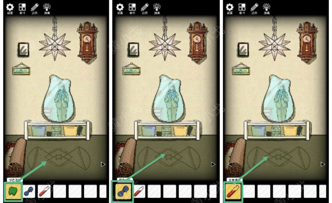 1.(时钟)点击时钟,根据画上的线索,调整时间为:17:45。获得【混合药剂A】(记住时钟上的符文)