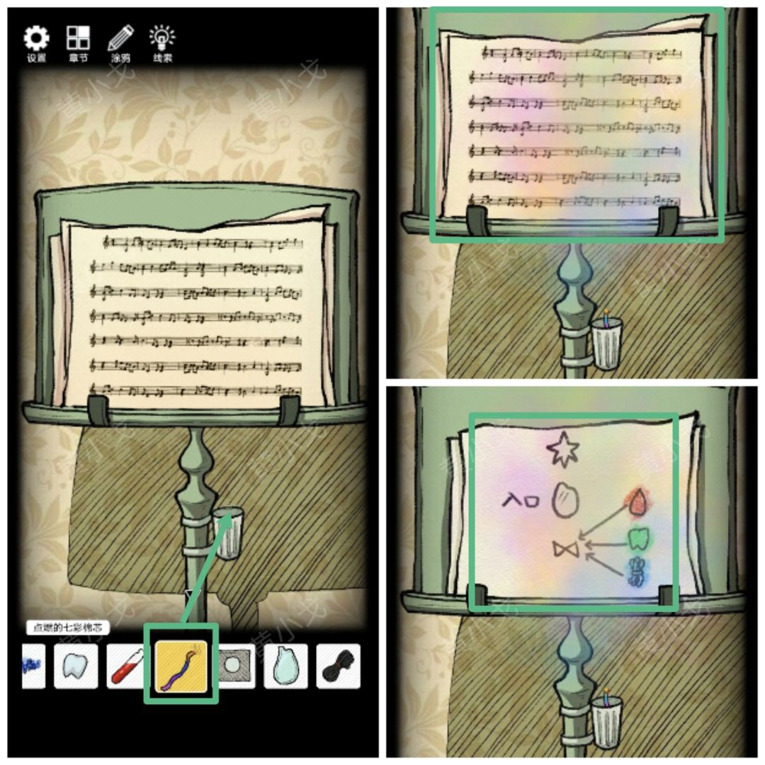 12.(乐器)点击乐谱架子,把【点燃的七彩棉芯】放入烛台,拿开乐谱,在空白纸上获得线索(开启法阵的媒介-镜子及所需物品-生命精华-红色、牙齿-绿色、头发-蓝色)