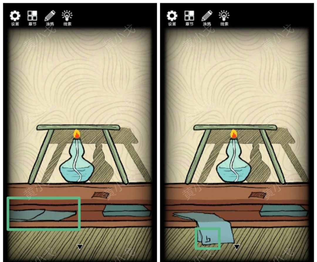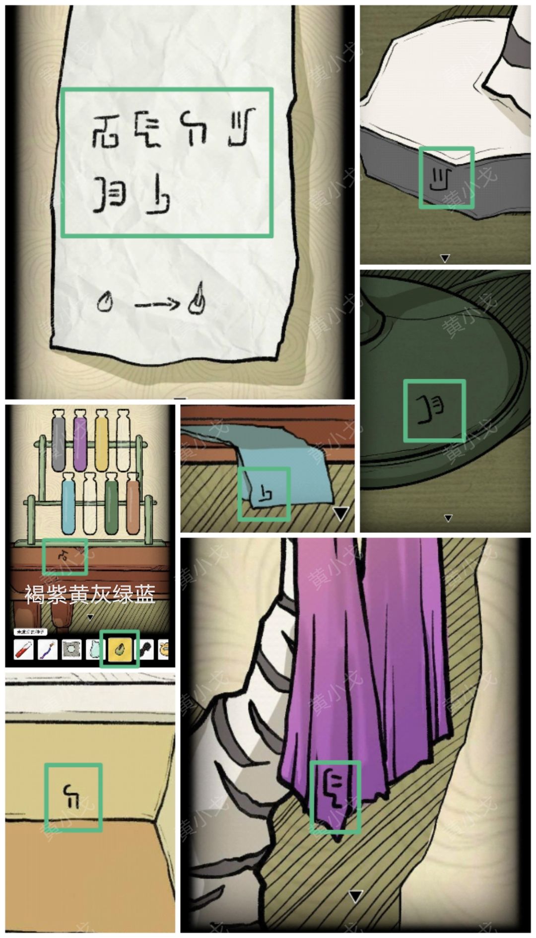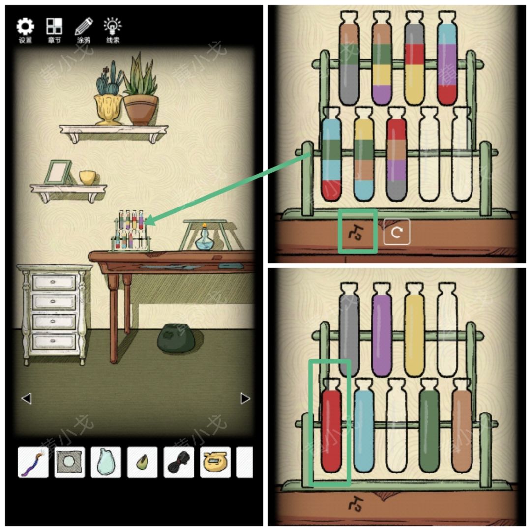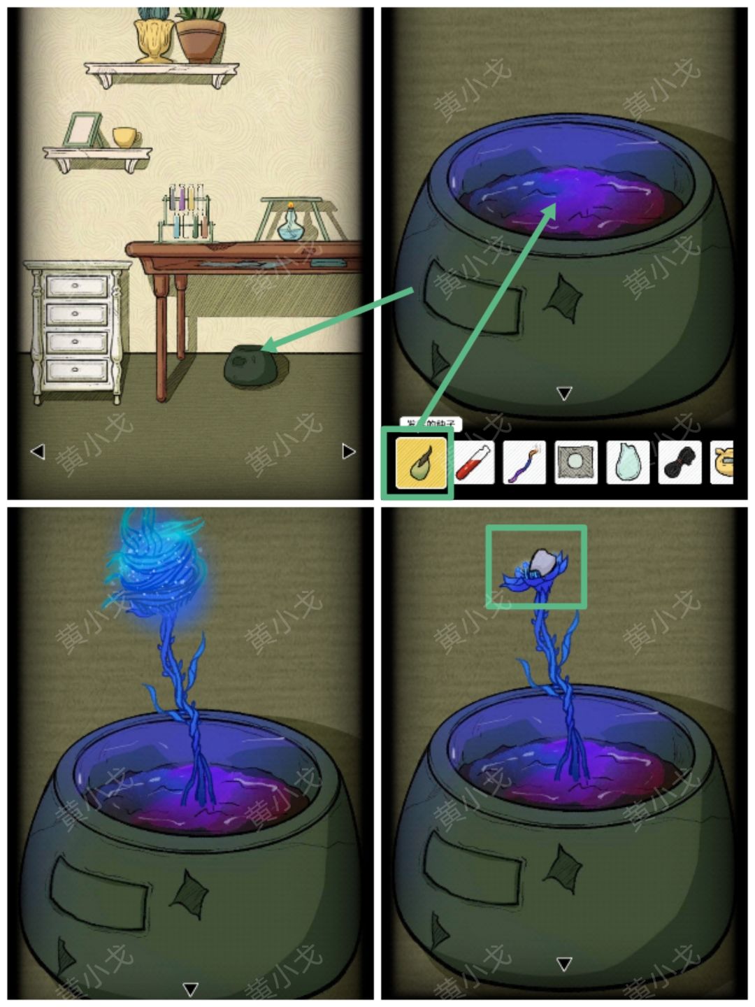 9.根据暗格里的纸条上的符文顺序,结合所有场景中物品上的符文及背景颜色(桌子上的符文-褐、围巾上的符文-紫、收纳箱里的符文-黄、树根上的符文-灰、灯座上的符文-绿、布上的符文-蓝),按(褐紫黄灰绿蓝)的顺序浸泡【未发芽的种子】